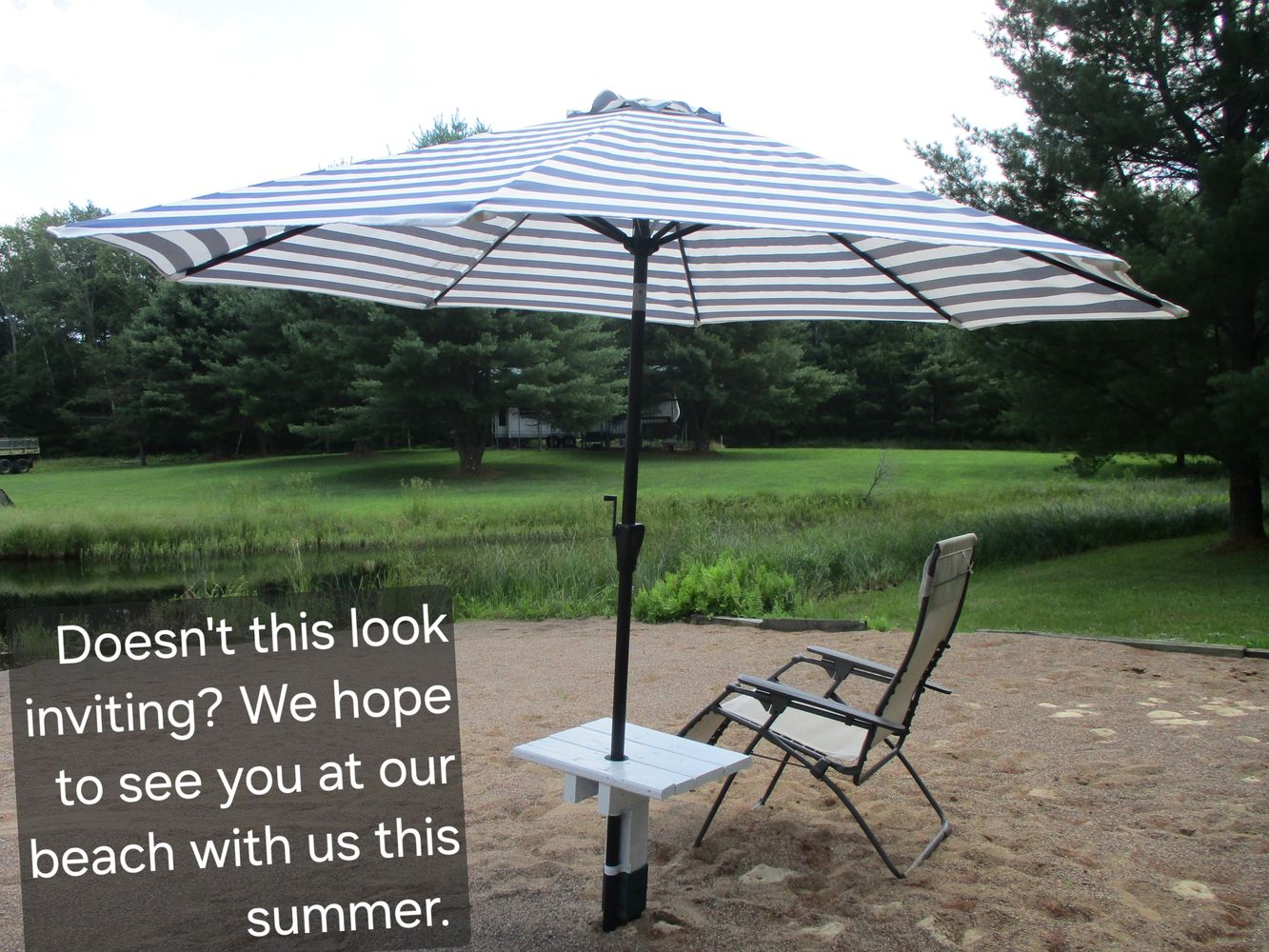 Amenities include a lodge, picnic shelter, indoor hot water shower, three outdoor hot water showers, a super clean outhouse, fresh water well, walking trails, and swimming pond with sand beach.